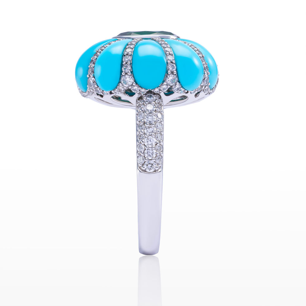 An Art Deco ring in 18K white gold, featuring a vivid 1.75-carat tsavorite at the center, framed by ten polished turquoise inlays totaling 4.48 carats, and accented with 0.91 carat of brilliant white diamonds. The Citrouille Enchanté Ring evokes the refined charm of a French pumpkin silhouette with radiant Deco symmetry.