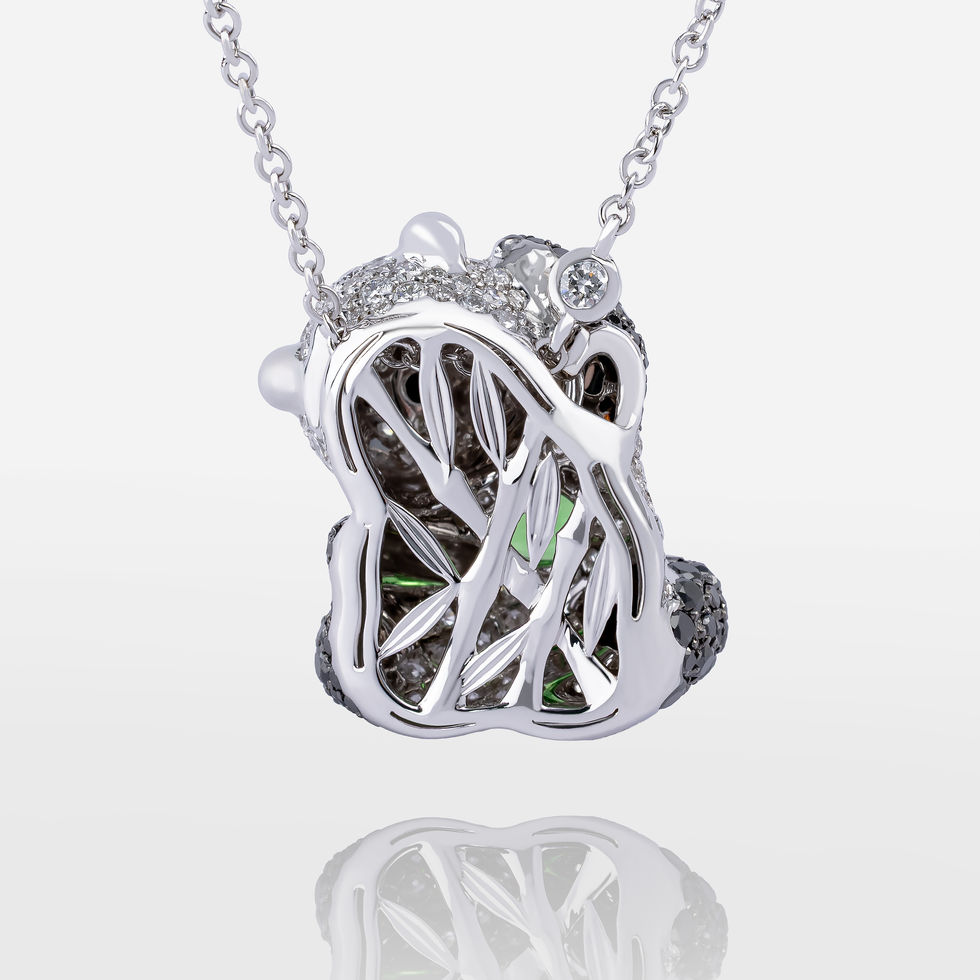 A luxurious panda-inspired necklace in 18K white gold, featuring 1.10 carat of vivid tsavorites, onyx details, 1.36 carat of black diamonds, and 1.52 carats of brilliant white diamonds. The Panda Gourmand Necklace blends playful charm with refined craftsmanship, characteristic of Zevu’s Creature Couture collection.