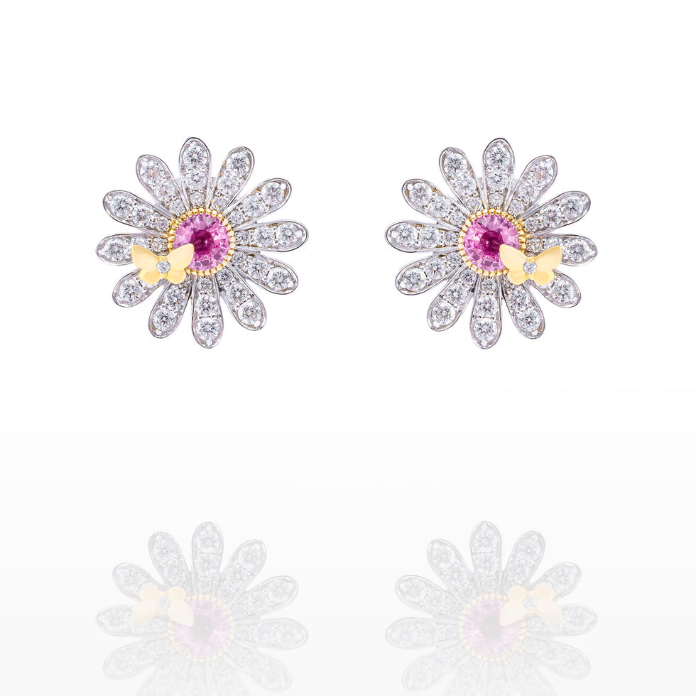Experience Zevu Jewellery’s Daisy Earrings in 18K white gold. Featuring 0.68ct of soft pink sapphires surrounded by 0.96ct of sparkling white diamonds, this floral design is accented with a delicate butterfly detail for a touch of whimsical charm. Gracefully crafted, it brings joyful femininity to everyday wear within the Des Fleurs collection.